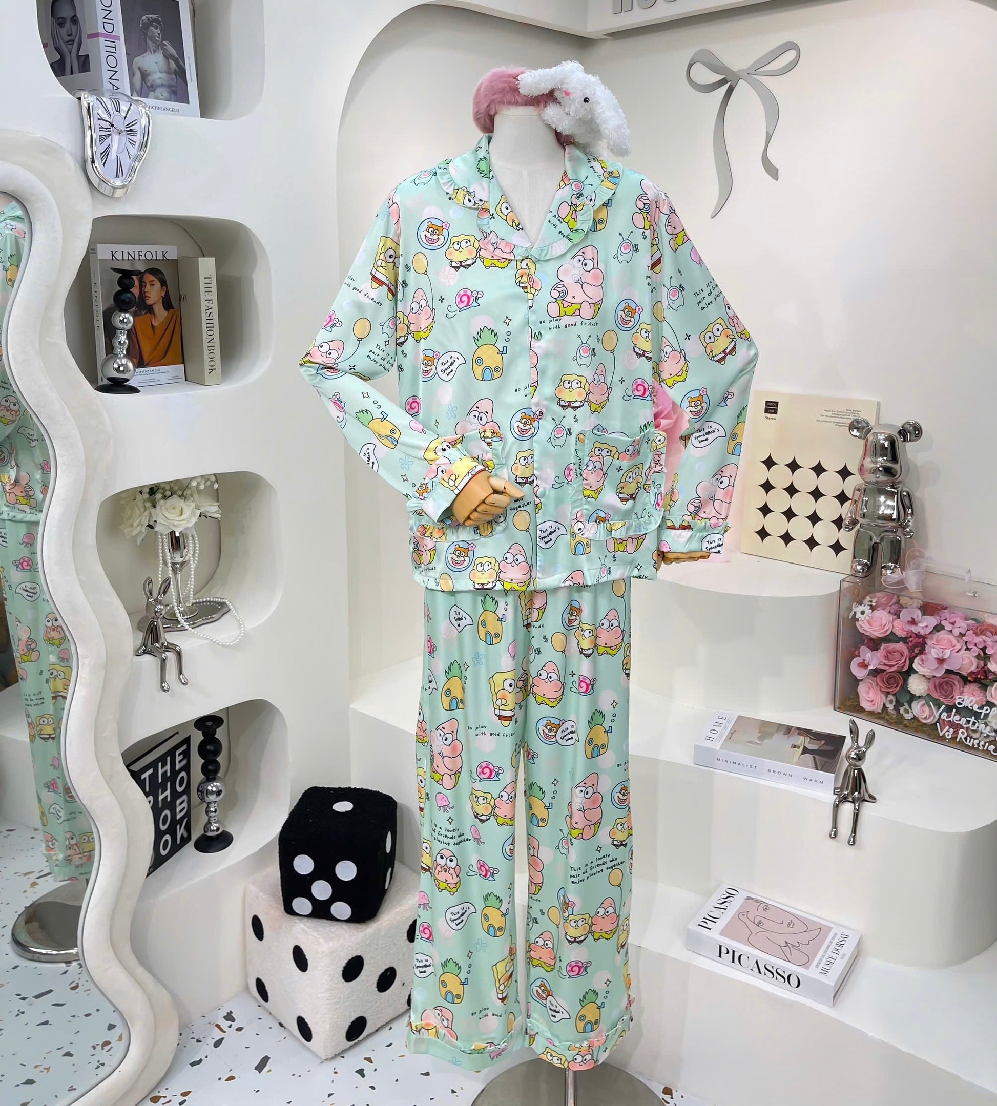 The Green Mint Spongebob Satin Pajama Set is the ultimate blend of comfort and fun. Made with high-quality satin material, this set includes a chic top, a pair of cozy shorts, and a matching scrunchy. The smooth, soft fabric feels luxurious against the skin, while the playful Spongebob design adds a cheerful touch. Perfect for lounging or sleep, this set brings both style and comfort to your downtime.