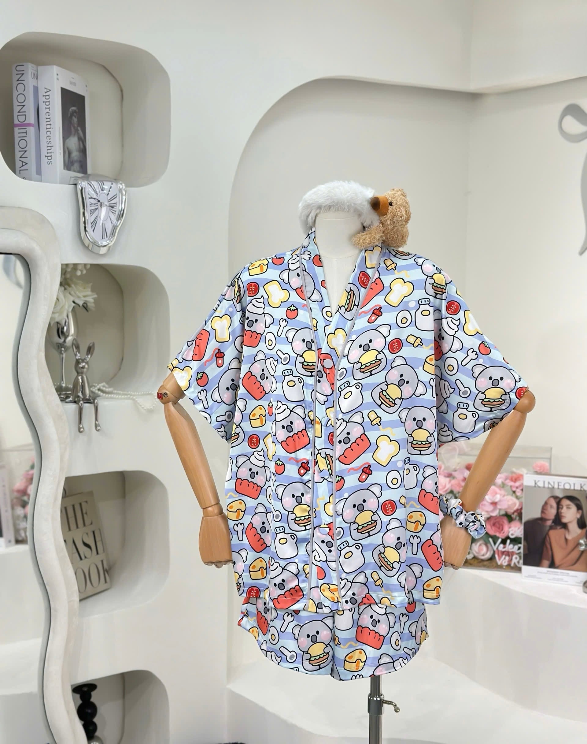 Blue Stripe Koala Satin V Neck Pajama Short Set
