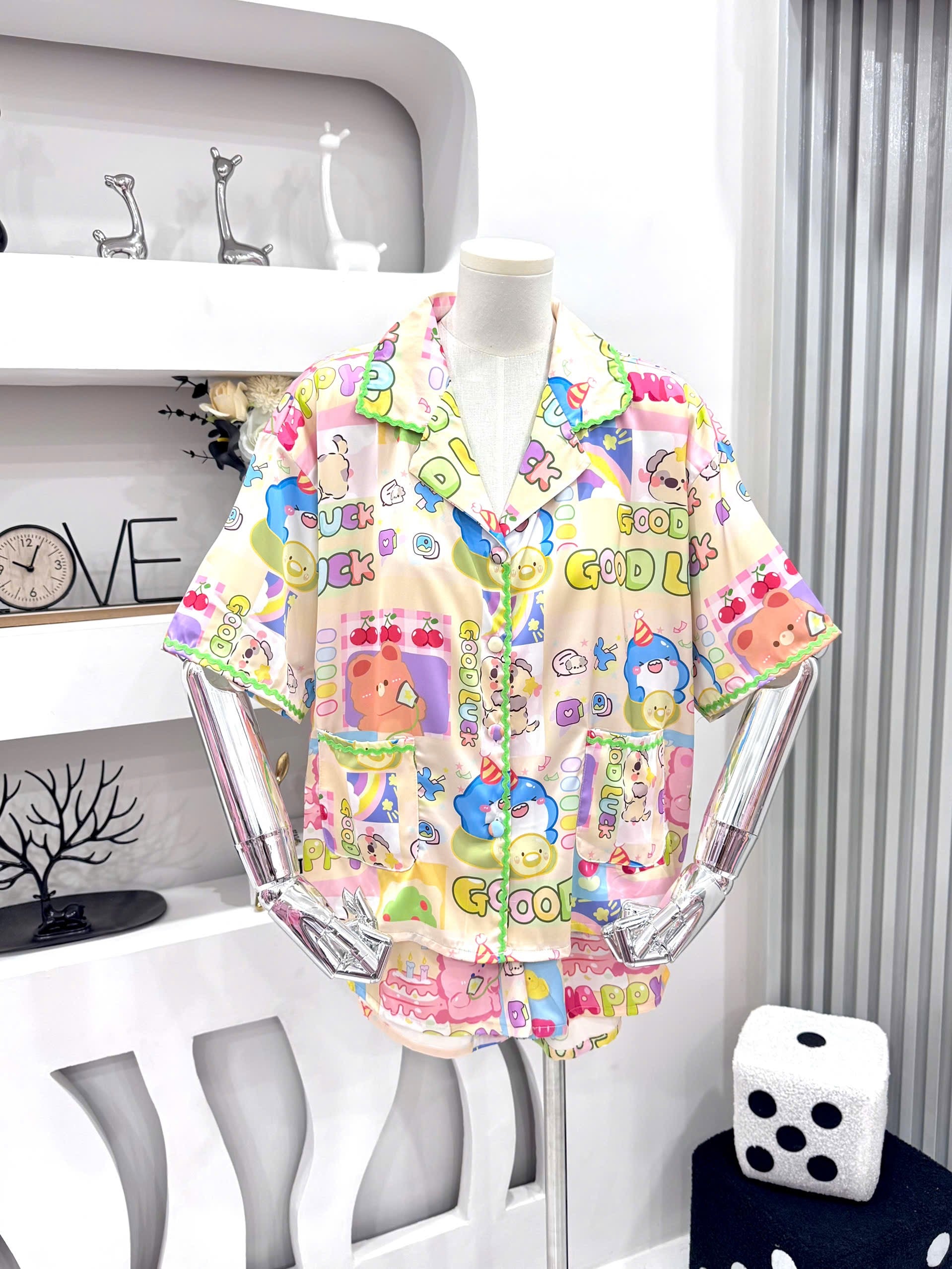 With a breezy button-up top and relaxed-fit shorts, it’s perfect for sleepovers, self-care nights, or just adding a little joy to your PJ drawer.