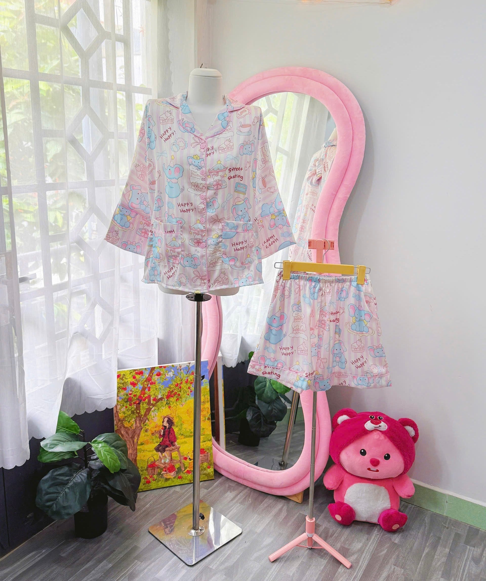 Happy Elephant Satin Pajama Mid-Length Sleeve Short Set