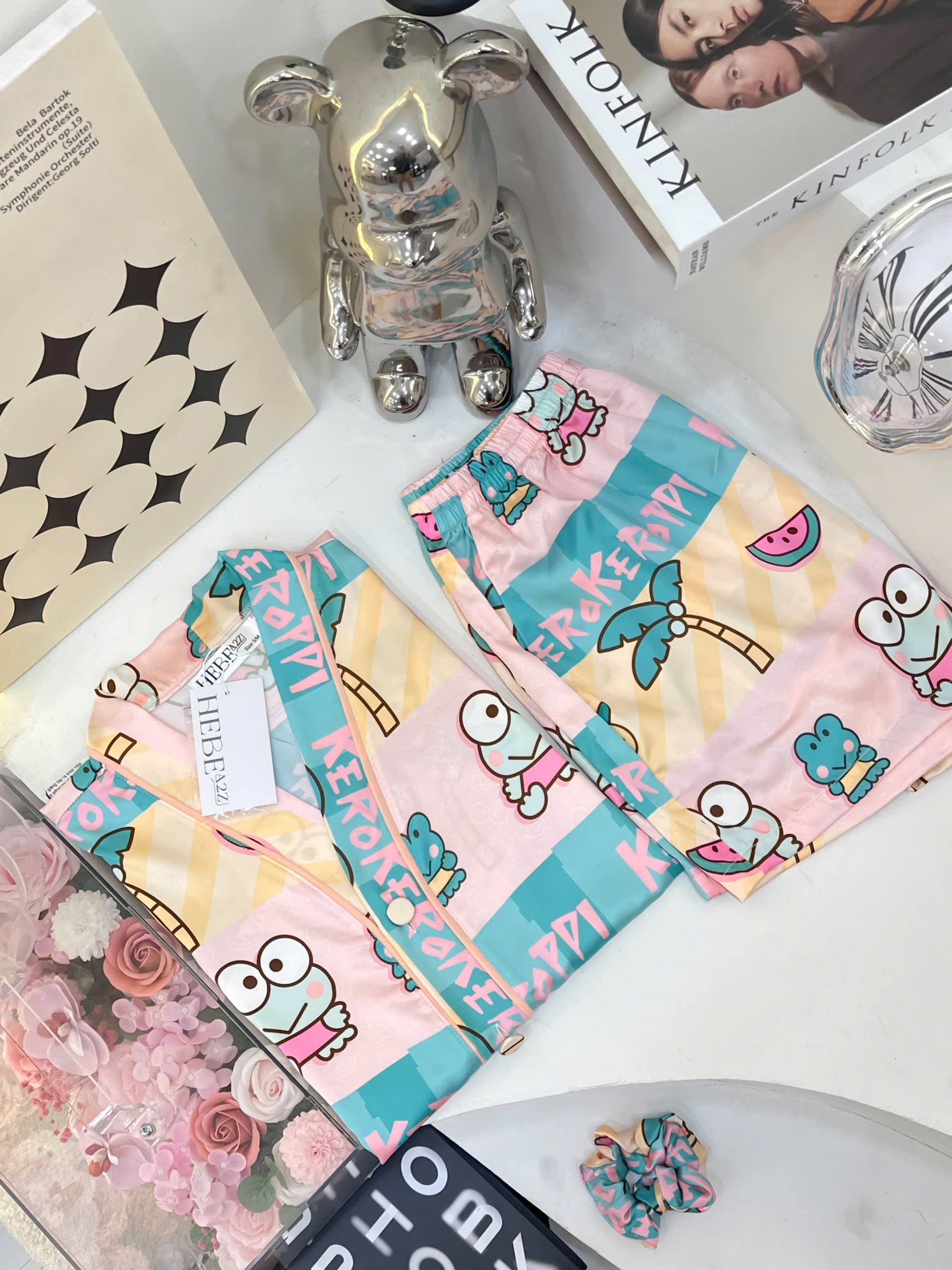 Drift into dreamy comfort with the Keroppi V-Neck Satin Pajama Short Set—a perfect blend of cuteness and luxury. Made from silky-soft satin, this lightweight set features a flattering V-neck top and matching shorts designed for ultimate relaxation. The playful Keroppi-inspired design adds a fun touch, making it ideal for lounging in style. Complete the look with the matching accessory, included for an extra dose of charm. Whether for a cozy night in or a cute sleepover look, this set is a must-have for Keroppi fans!