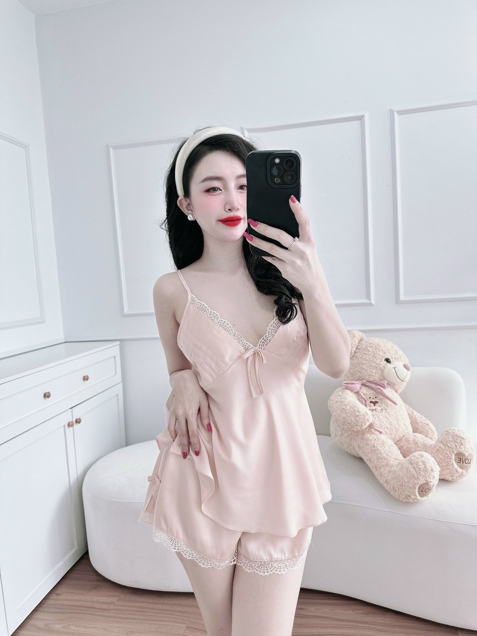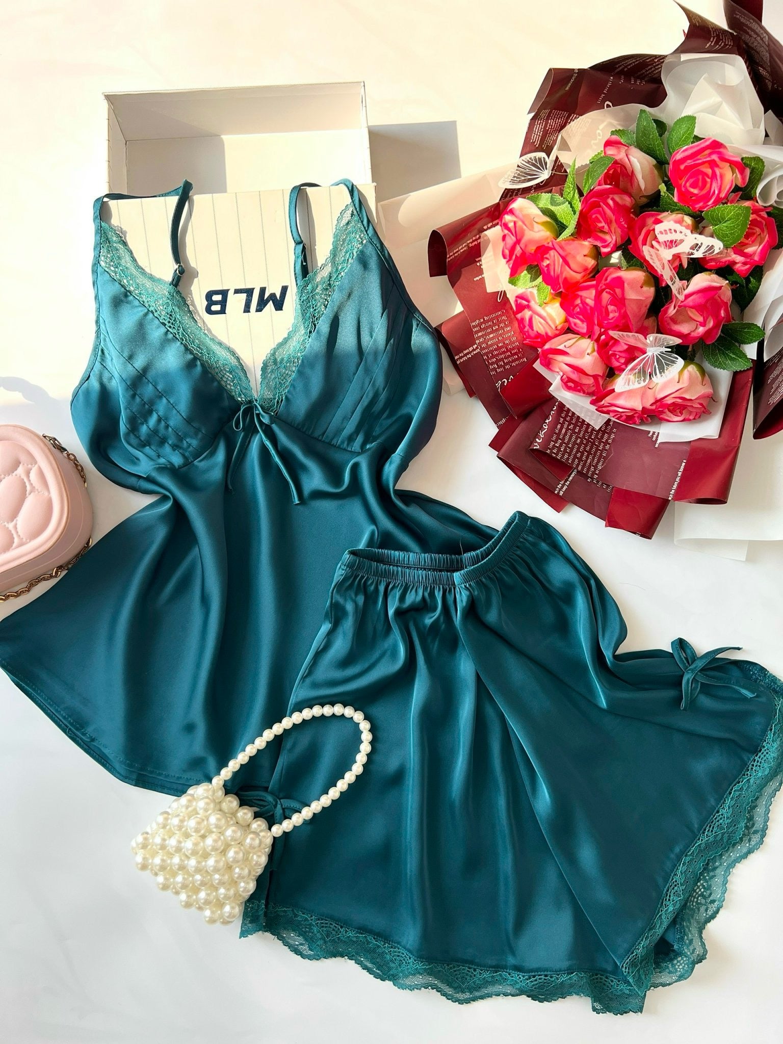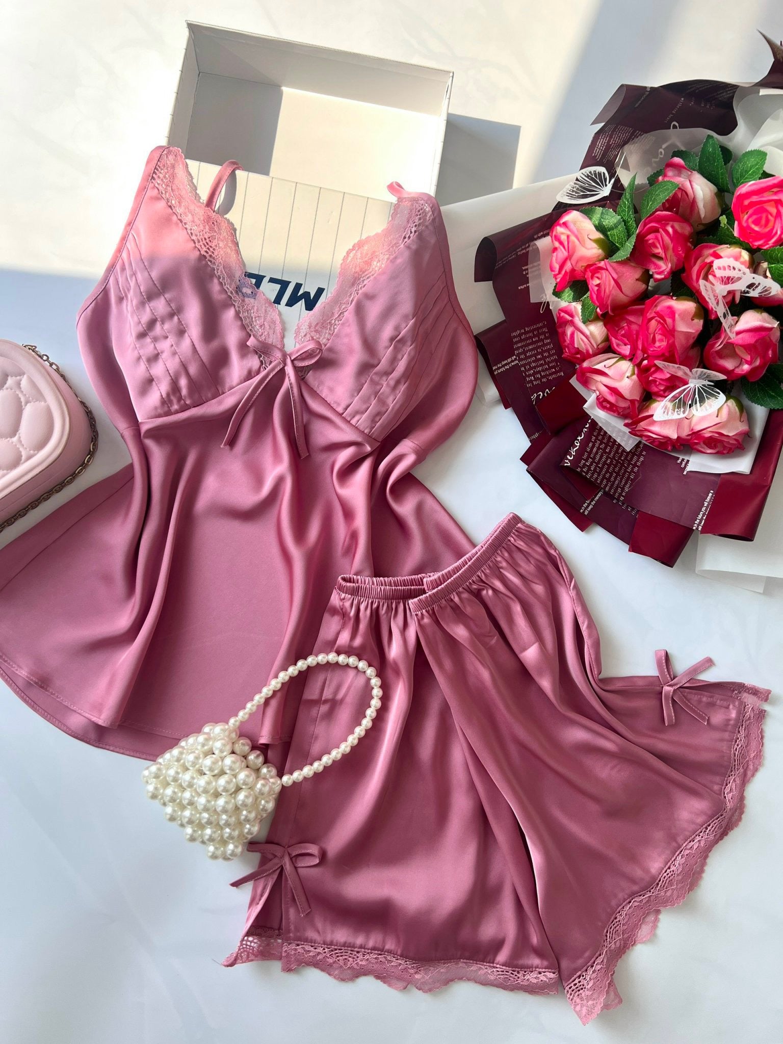 Lace Pleated Detail Simplicity Tank Top Satin Pajama Short Set