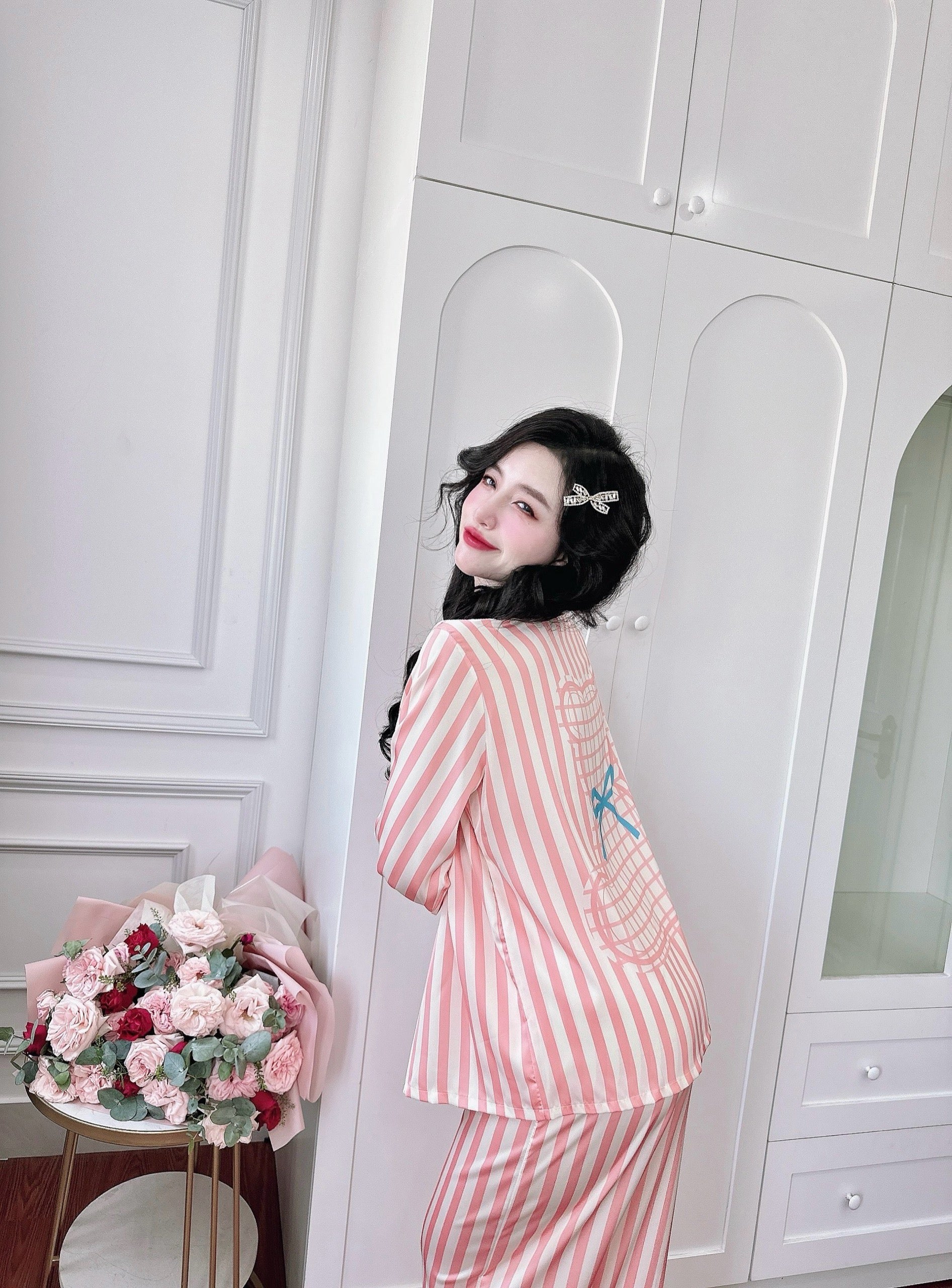 Petite Coral Stripe Bear Satin Pajama Long Sleeve