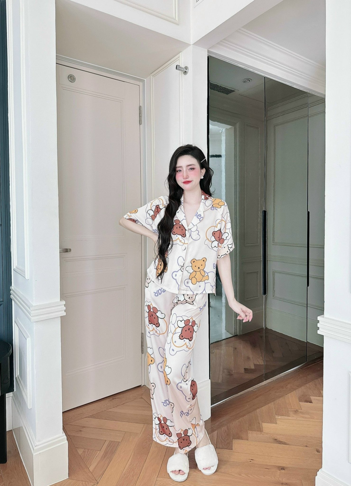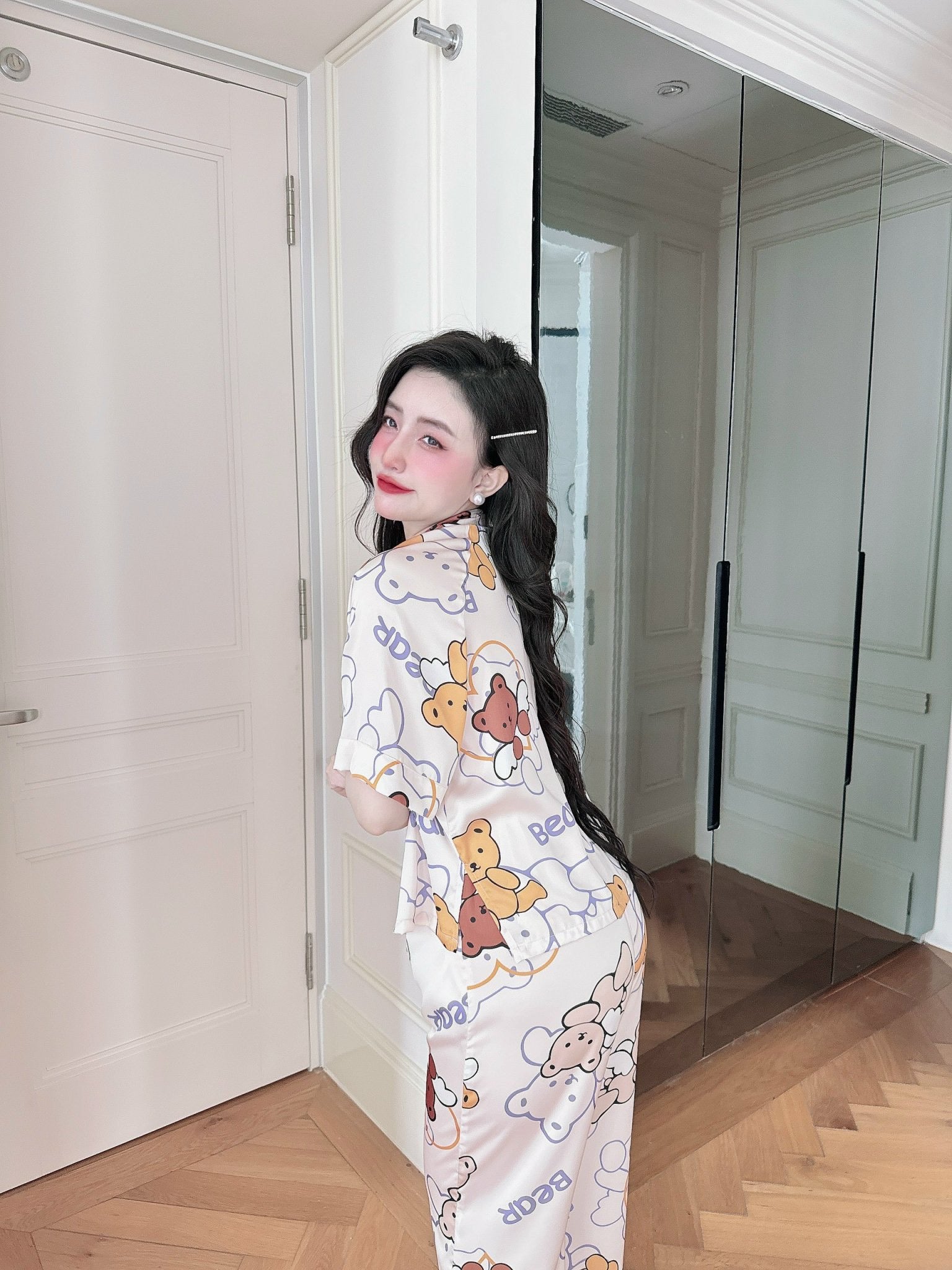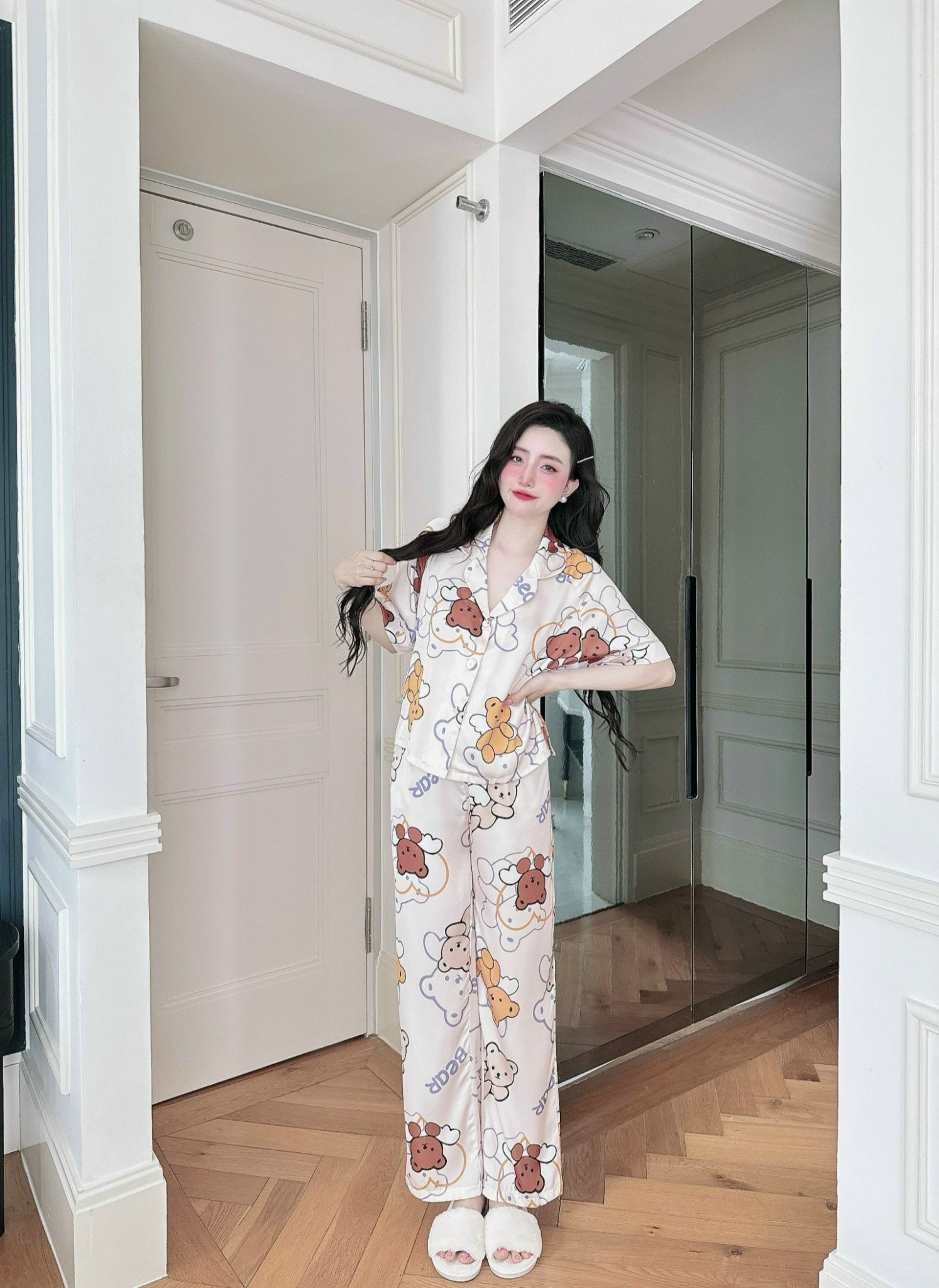 Petite Cute Teddy Bear Pattern Satin Pajama Short Sleeve