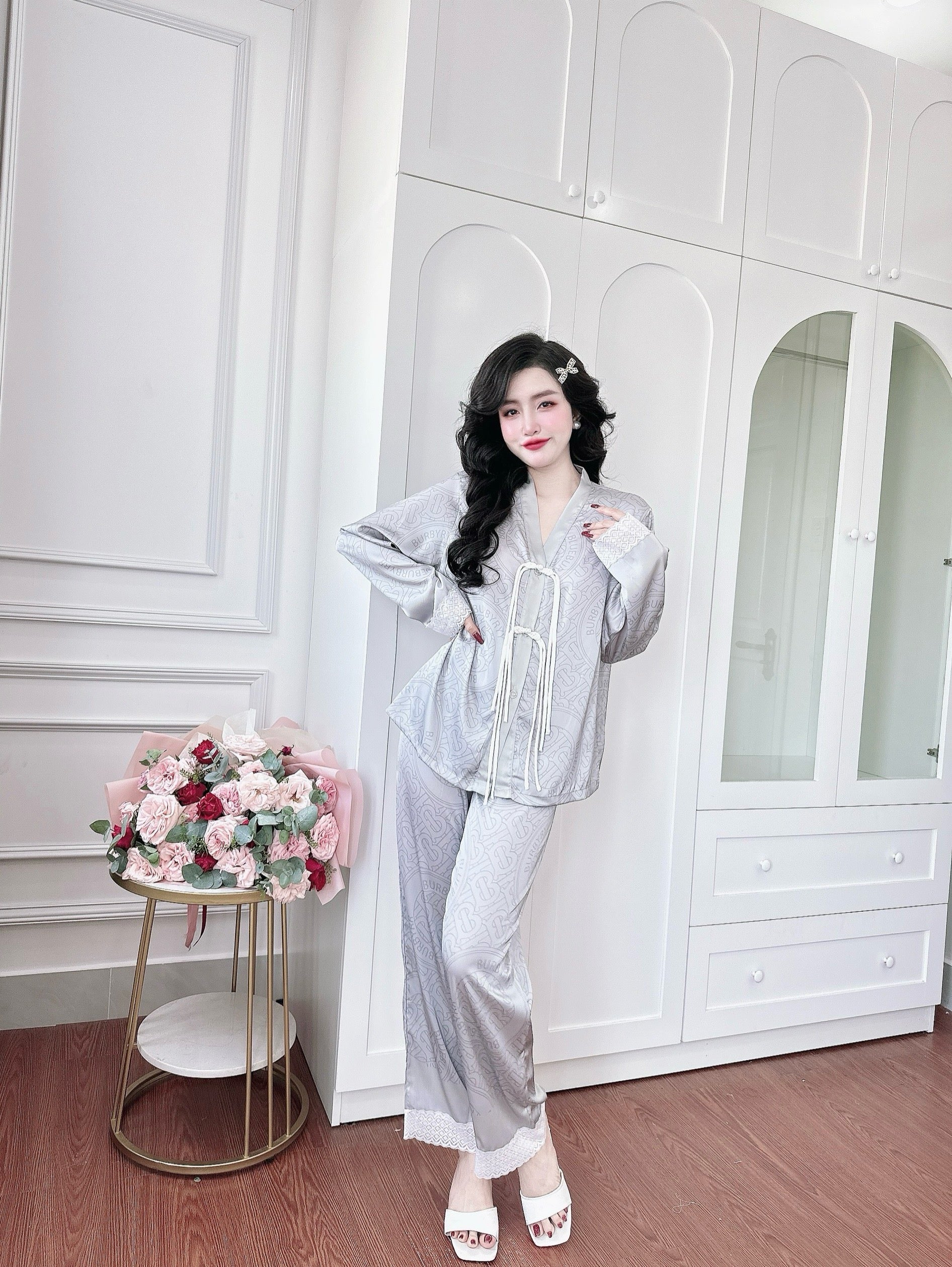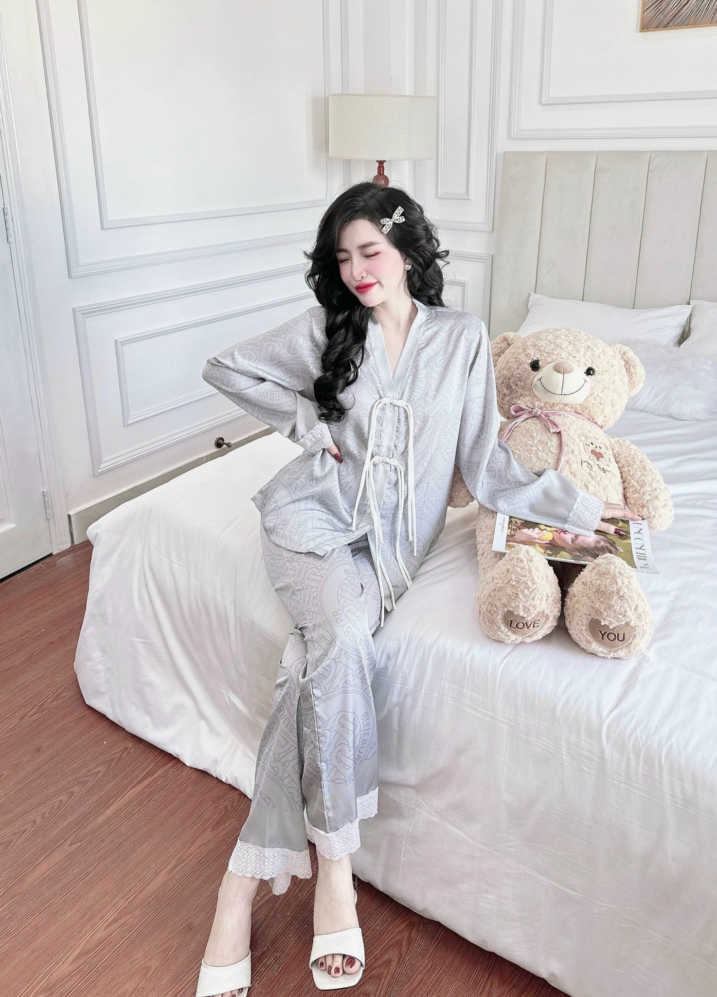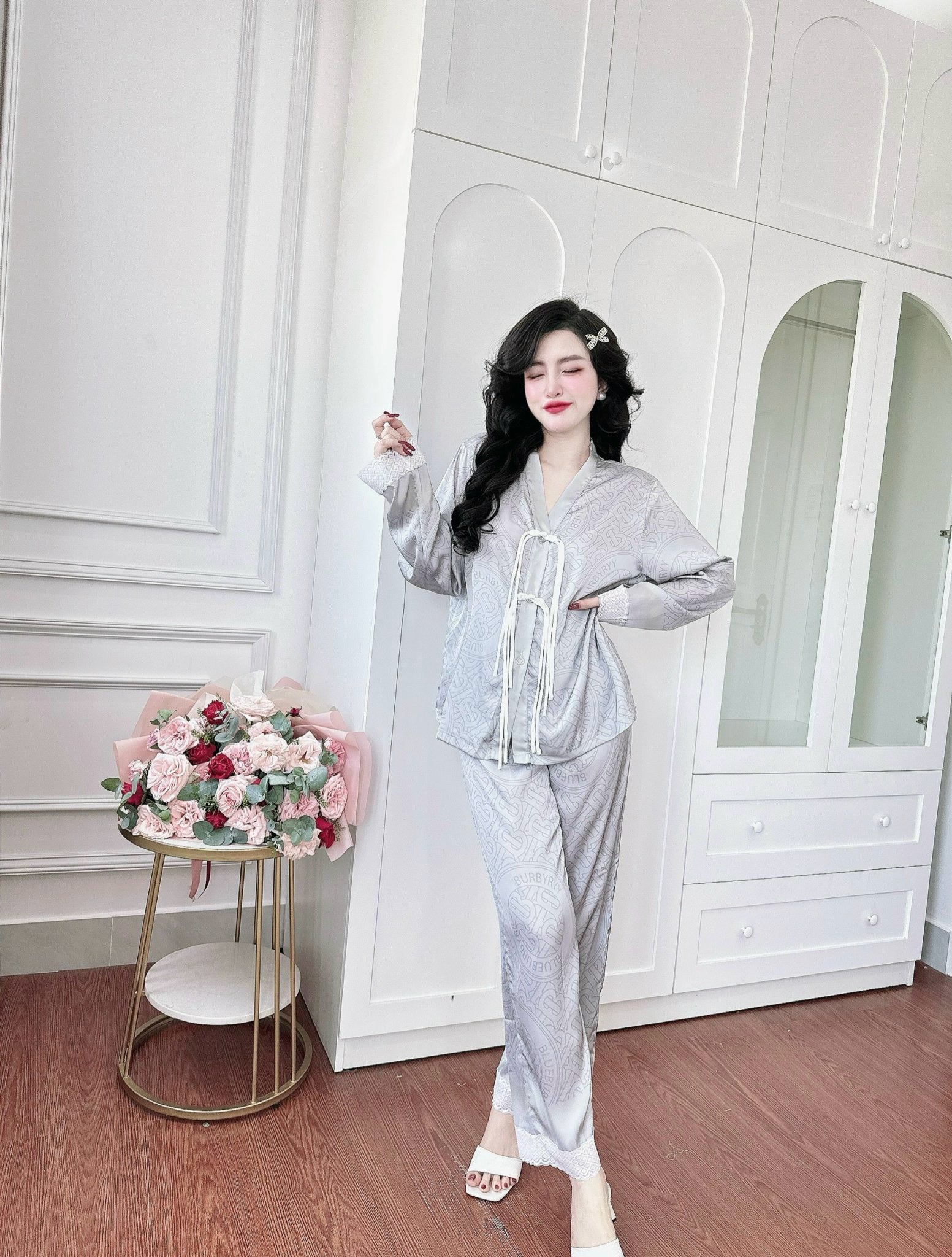 Petite Gray Designer Pattern Satin Pajama Long Sleeve