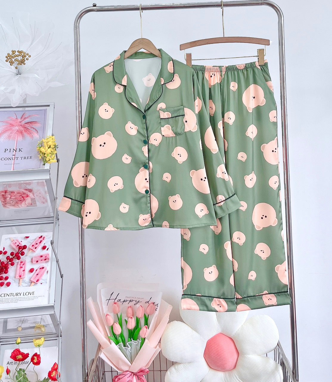 Petite Green Cute Bear Pattern Satin Pajama Long Sleeve