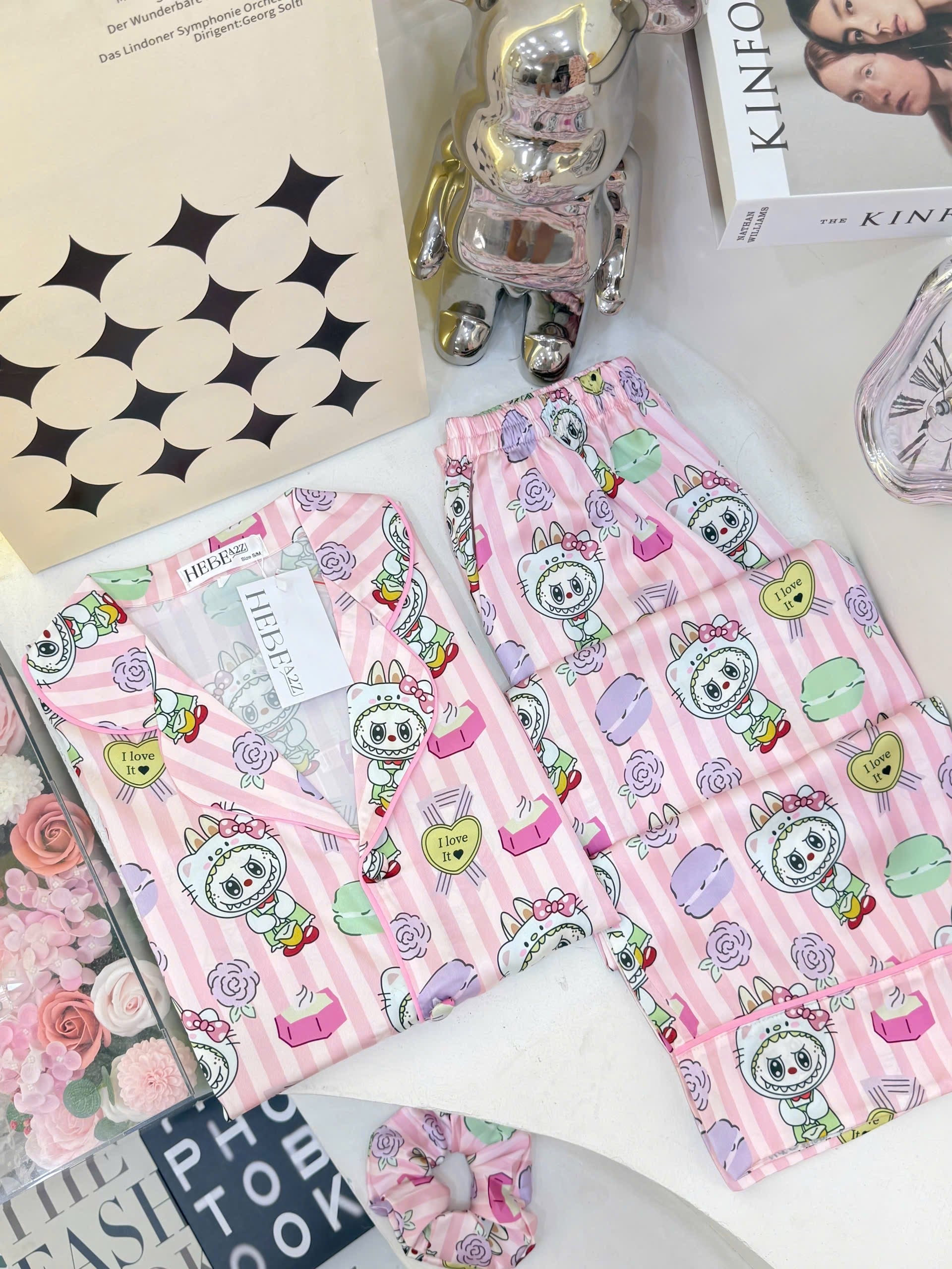 Pink Stripe Labubu Hello Kitty Satin Pajama Short Sleeve