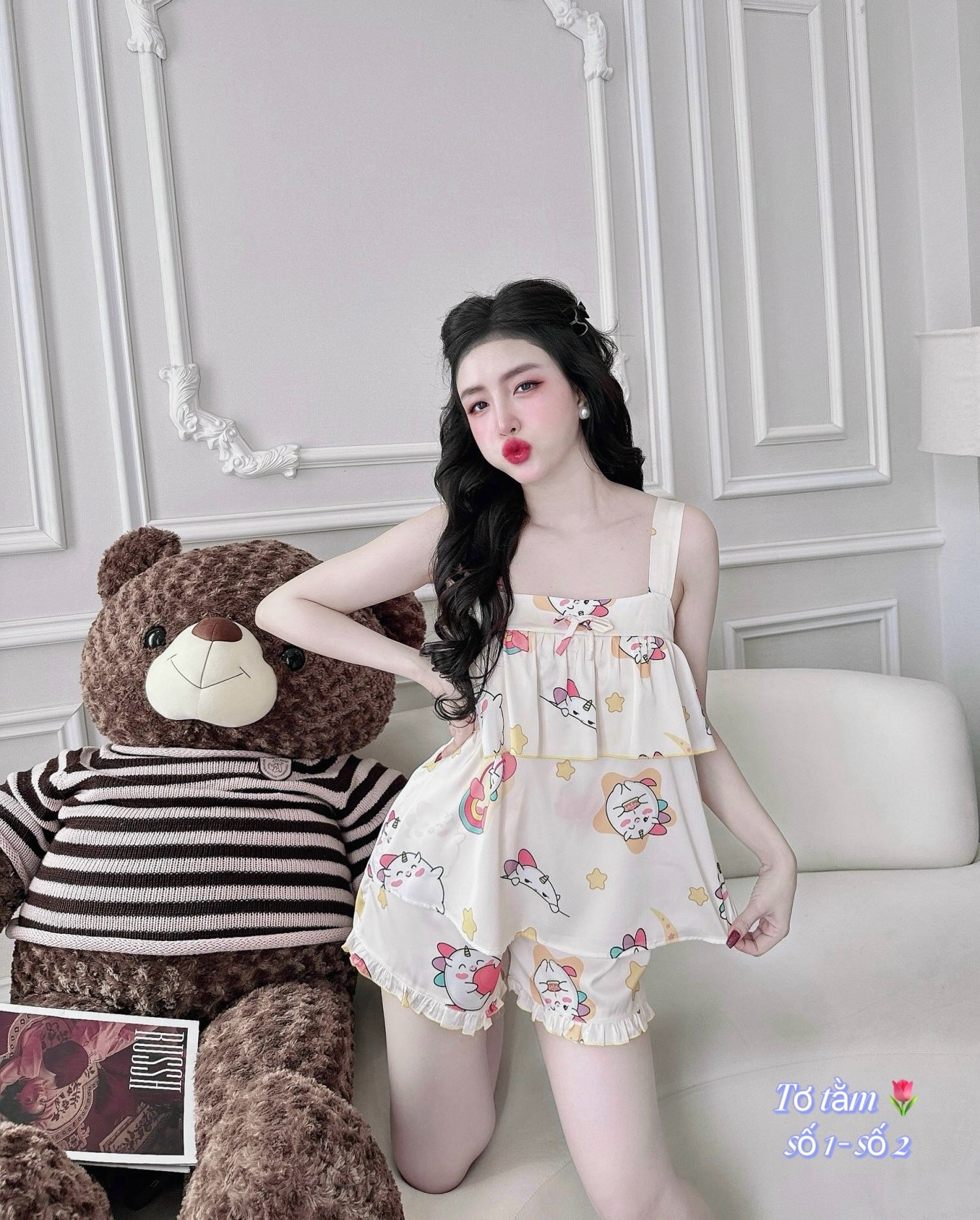 Satin Thick Strap Tank Top Layers with Cute Characters Pajama Short Set